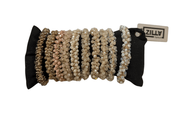 ZILLA Armband Kristal Elastisch Naturel (10 stuks) bestaat uit glaskraaltjes in zachte, natuurlijke tinten die zorgen voor een rustige en elegante uitstraling. Dankzij het elastische ontwerp zijn de armbandjes niet alleen prettig om de pols te dragen, maar ook handig te gebruiken als haarelastiek.