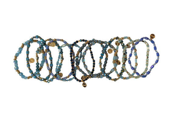 Set van 12 ZILLA glas armbandjes in blauwtinten met goudkleurig metaal. Luxe uitstraling, elastisch en passend om elke pols.
