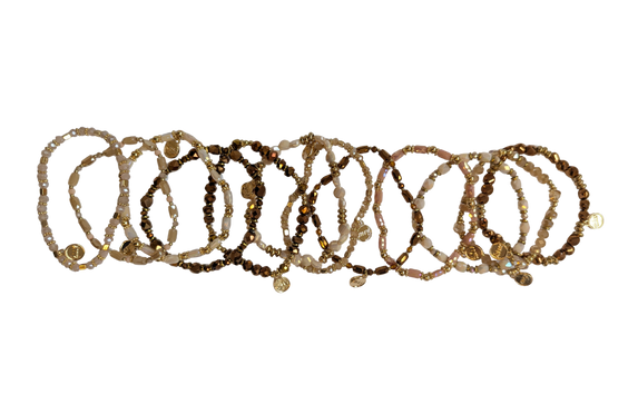 Set van 12 ZILLA glas armbandjes in naturel- en bruintinten met goudkleurig metaal. Warme uitstraling, elastisch en passend om elke pols.