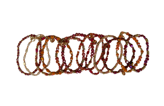 Set van 12 ZILLA glas armbandjes in rood- en oranjetinten met goudkleurig metaal. Warme uitstraling, elastisch en passend om elke pols.